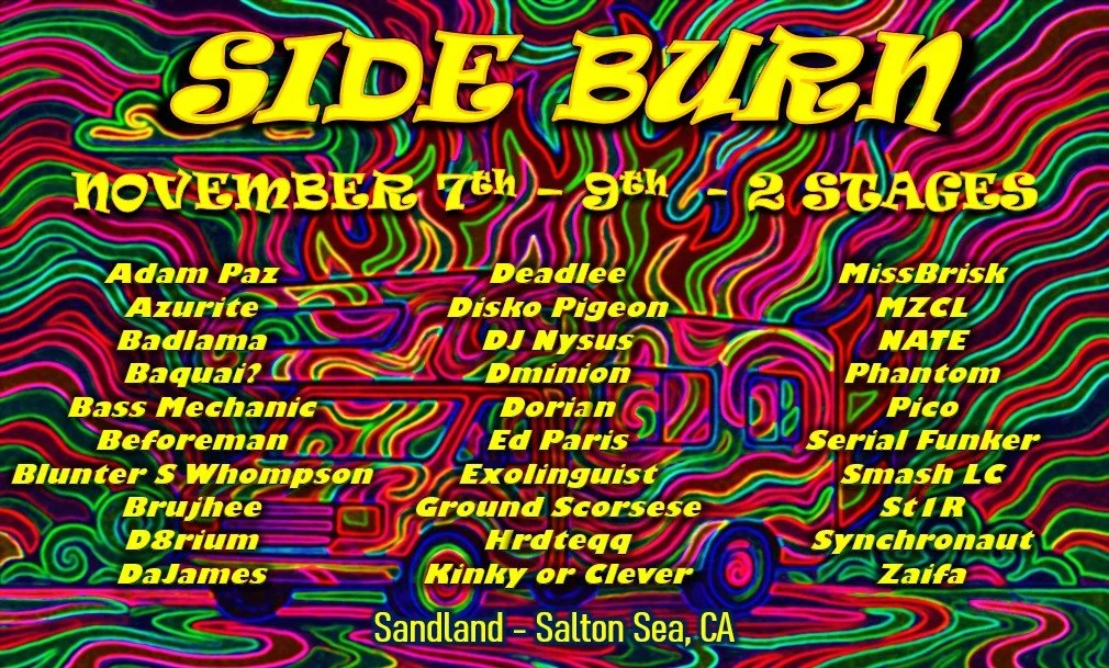 Nov 7 to Nov 9 Side Burn 2025 Fri, Nov 7, 2025 12:00 PM Sun, Nov 9, 2025 1:00 PM Google Calendar ICS Side Burn 2025 RSVP View Event → Nov 1 to Nov 3 Side burn 2024 Fri, Nov 1, 2024 9:00 AM Sun, Nov 3, 2024 3:00 PM Niland, CA, 92257 United States (map) Google Calendar ICS Bombay Beach, CA View Event → Nov 18 to Nov 19 Sunset Synthesis Sat, Nov 18, 2023 9:00 AM Sun, Nov 19, 2023 10:00 AM Hollywood-Vine Campsite (map) Google Calendar ICS Bombay Beach, CA View Event → Nov 9 to Nov 12 Side Burn 2023 Thu, Nov 9, 2023 9:00 AM Sun, Nov 12, 2023 12:00 PM Side Burn - Bombay Beach (map) Google Calendar ICS Bombay Beach, CA View Event → Mar 31 to Apr 2 Rebirth 2023 Fri, Mar 31, 2023 9:00 AM Sun, Apr 2, 2023 4:00 PM Salton Sea (map) Google Calendar ICS Salton Sea View Event →